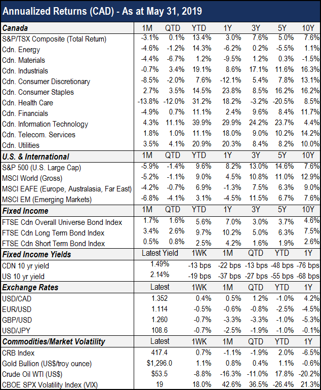 Equities around the globe came under pressure last month, with fears of a protracted Sino-U.S. trade war and softer global economic data weighing on investor appetite. While we do not believe the rally in stock prices is over for the cycle, an extended period of market churning would come as no surprise. The rationale for continued equity market expansion hinges on the catalysts of trade policy, central bank accommodation, economic growth, and corporate earnings. Until then, markets remain vulnerable. Last month the Canadian and U.S. stock markets returned -3.1% and -5.9%, respectively. International and emerging stock markets posted returns of -4.2% and -6.8%. All four major markets remain in positive territory year-to-date, up anywhere from 3.1% (EMs) to 13.4% (Canada).